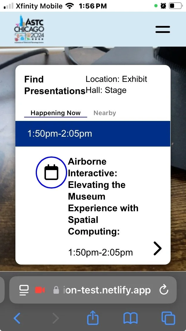 Users scan a marker and a modal pops up with information about what presentations are happening now and nearby.